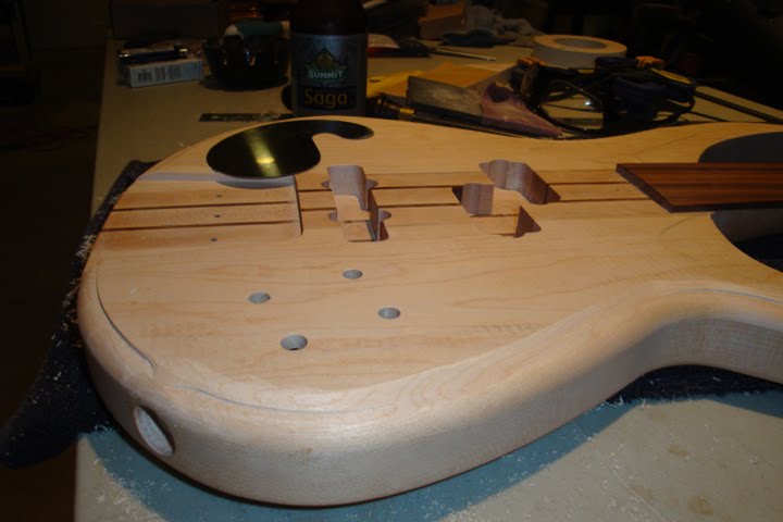 Body carve completed. There are some very subtle cutaways on the inner horns that are hard to see in this photo. Normally on a guitar they are to aid in accessing the upper frets. I added them mainly for an artistic sense as I have no issues reaching the 24th fret or even beyond.
