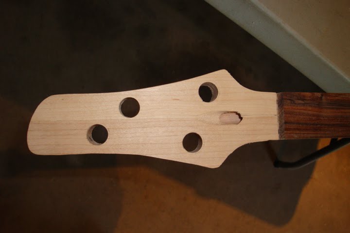 Not a whole lot to show at this point. Still sanding. The whole bass is being sanded to 600 grit and will then be wiped down and the clear coat will be added. First however I need to finish my headstock inlay. I have cut it out of rosewood (pictured below) but need to do a little more smoothing. After the inlay is ready I can cut the pocket for it in the headstock. I am a little nervous about doing this as I could screw the headstock up with any minor mistake. It is possible I will chicken out and just use a decal this time around.